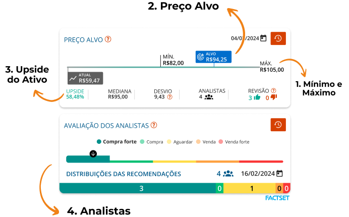 Com ele você poderá consultar a média da opinião de analistas do mercado financeiro ao redor do mundo sobre os ativos, com o respectivo viés (comprar, aguardar ou vender) e o consenso sobre o preço-alvo.