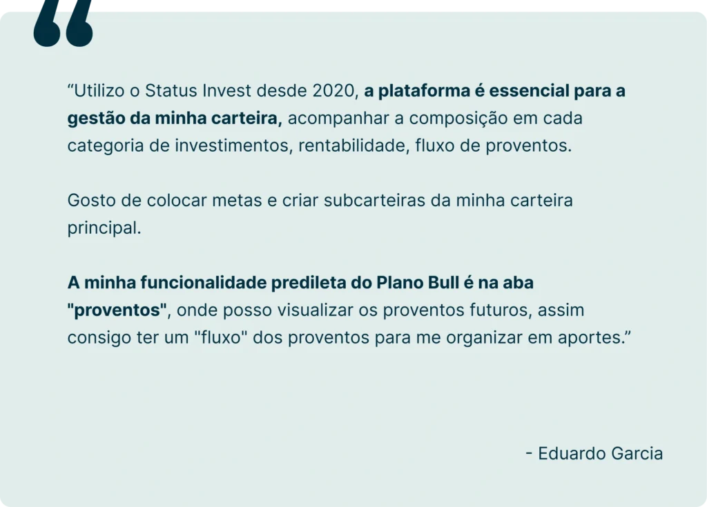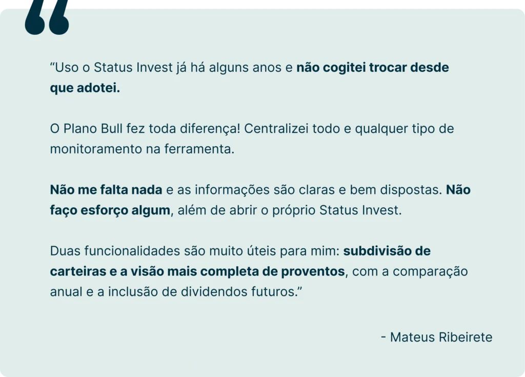 O Plano Bull é o nosso plano avançado de gerenciamento de carteira. Nele, você poderá aumentar o limite de ativos que está seguindo, cadastrar carteiras e sub carteiras, ter acesso à média dos indicadores de diferentes setores, subsetores e segmentos, checar histórico de aluguel dos ativos e da remuneração de acionistas e muito mais.